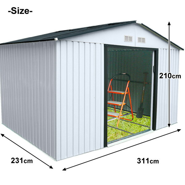 ●素材:スチール ●商品サイズ(cm):幅約311×奥行約231×高さ約210 ●設置に必要な面積 (cm) :幅約321×奥行約242(屋根部分含む為) ●開口サイズ(cm):幅約130×高さ約157 ●重量(約):100kg ※3個口での発送となります。