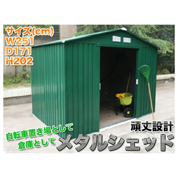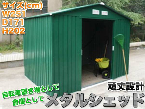 ●素材:スチール ●商品サイズ(cm):幅約251×奥行約171×高さ約202 ●設置に必要な面積 (cm) :幅約261×奥行約183(屋根部分含む為) ●開口サイズ(cm):幅約109×高さ約157 ●重量(約):74kg ※組み立てが必要な商品になります。