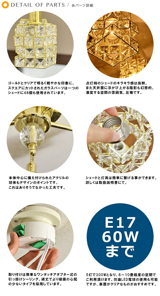 ※電球セレクト記号一覧を開く※ サイズ ・全体:H540×Φ520(mm)※プルスイッチ含む ・フランジ:H170×Φ140(mm) ・シェード:H110×Φ120(mm) ・プルスイッチ:370mm(脱着可能) 重量 4kg 素材 ガラス/スチール/アクリル スイッチ 壁/プルスイッチ ※プルスイッチ点灯切替(5灯→3灯→2灯→OFF) 取付方法 簡単取付(引掛シーリング) 参考設置場所 リビング/ダイニング/寝室/プライベートルームー/子供部屋/ワンルーム/etc. 参考使用空間 モダン/ゴージャス/スタイリッシュ/ミッドセンチュリー/アンティーク/デザイナーズ//SOHO/アメリカン/etc. コメント キーワードはスクエア。