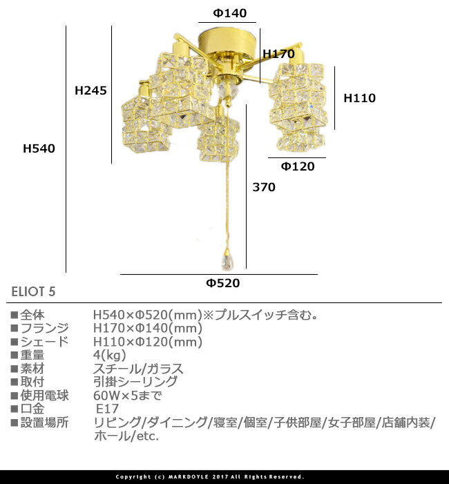 商品名 ELIOT 5:エリオット 5 品番/型番 MDOD-10048 使用電球 ・口金:E17 ・消費電力:1灯60Wまで ・灯数:5灯 お選び頂けます。
